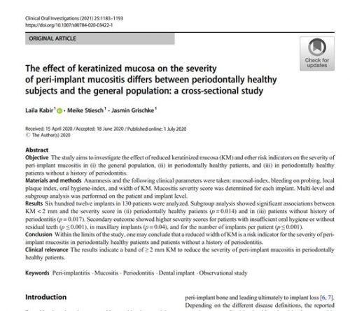 Kabir y col. (2021) presentaron un estudio transversal en el cual describieron el efecto de la deficiencia de mucosa queratinizada sobre la mucositis periimplantar. Analizaron 612 implantes en 130 pacientes y encontraron una asociación significativa entre mucosa queratinizada de < 2mm y severidad de periimplantitis (p= 0.014) en pacientes sanos y en pacientes sin historia de periodontitis.  Los valores fueron aún más altos en pacientes con higiene deficiente o sin dientes remanentes (p≤ 0.001).