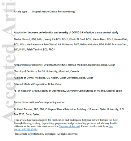 De acuerdo a un estudio observacional liderado por los Drs. Sanz y Tamimi, se identificó que la periodontitis se asocia significativamente con un mayor riesgo de complicaciones por COVID-19, incluida la admisión en la Unidad de Cuidados Intensivos, la necesidad de ventilación asistida, e incluso la muerte.