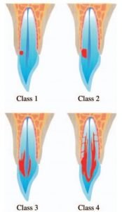 Clase 4: lesión amplia que se extiende más allá del tercio coronal de la raíz. Clínicamente, se puede observar una coloración rosada en la región cervical de la corona dentaria. La radiografía muestra una imagen radiolúcida en la corona y líneas radiolúcidas que se extienden a lo largo del conducto radicular y que pueden llegar hasta el tercio apical.